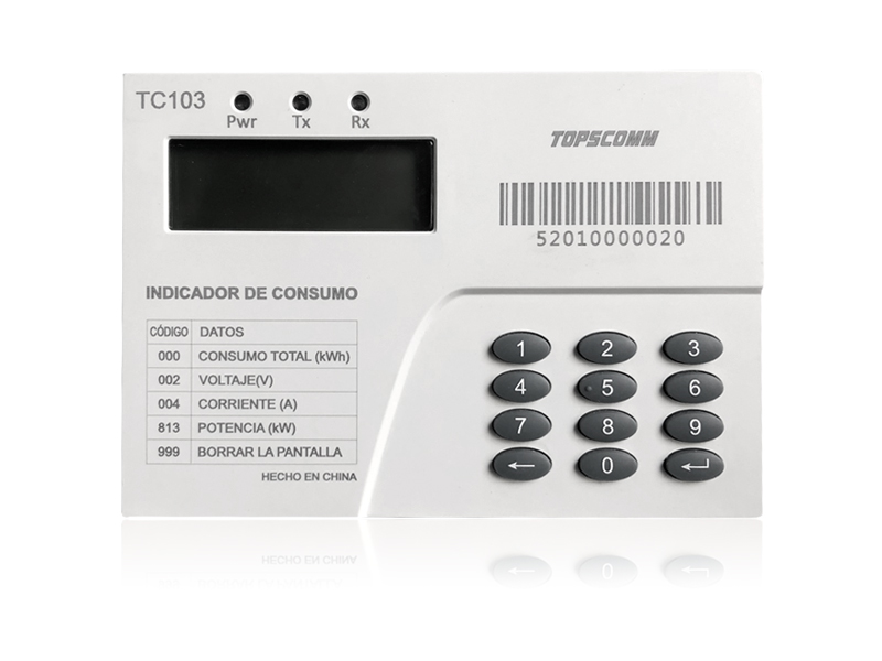 لوحة مفاتيح الدفع المسبق TOPSCOMM TC103 هي وحدة واجهة مستخدم (CIU) مصممة خصيصًا لتوفر للعميل واجهة سهلة الاستخدام لتشغيل عداد الدفع المسبق. وتتمثل الوظيفة الرئيسية لوحدة واجهة المستخدم في: تمكين المستخدم من إدخال رموز الدفع المسبق لإضافة رصيد جديد وعرض المستهلك لأغراض كفاءة الطاقة . تعتمد عملية الدفع المسبق على تشفير رمز الدفع المسبق STS.