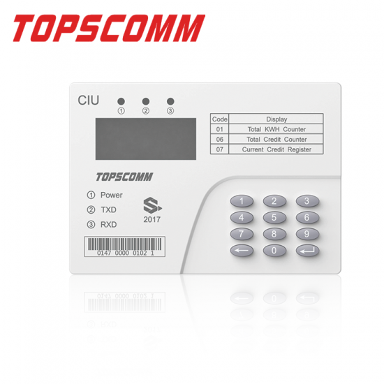 لوحة مفاتيح الدفع المسبق TOPSCOMM TC103 هي وحدة واجهة مستخدم (CIU) مصممة خصيصًا لتوفر للعميل واجهة سهلة الاستخدام لتشغيل عداد الدفع المسبق. وتتمثل الوظيفة الرئيسية لوحدة واجهة المستخدم في: تمكين المستخدم من إدخال رموز الدفع المسبق لإضافة رصيد جديد وعرض المستهلك لأغراض كفاءة الطاقة. تعتمد عملية الدفع المسبق على تشفير رمز الدفع المسبق STS.